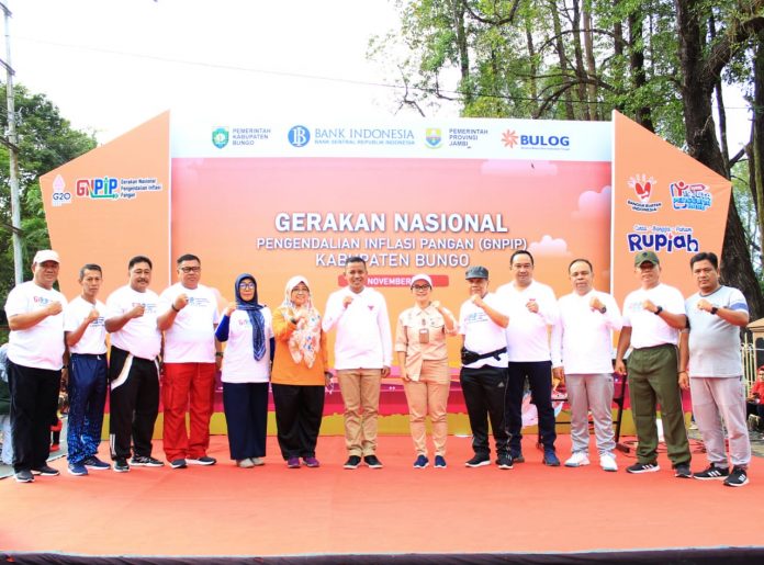 Muara Bungo – Bank Indonesia bersama Tim Pengendalian Inflasi Daerah (TPID) Kabupaten Bungo menggelar acara Gerakan Nasional Pengendalian Inflasi Pangan (GNPIP) di momen car free day depan rumah dinas Bupati Bungo, Minggu (27/11/2022).